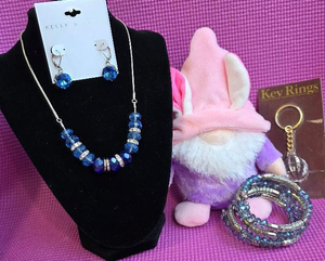 Brunda, the pastel Easter troll, presents April’s contest prize: a blue-and-white crystal necklace, blue crystal pierced earrings, and a stretchy blue crystal bracelet! Brunda is part of the prize, along with a cute keychain!